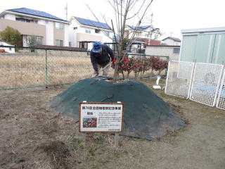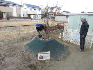 寒さ厳しい中、資料保存会のメンバーが、里庄町歴史民俗資料館の庭に植樹された2本のキクザクラに施肥をしました。